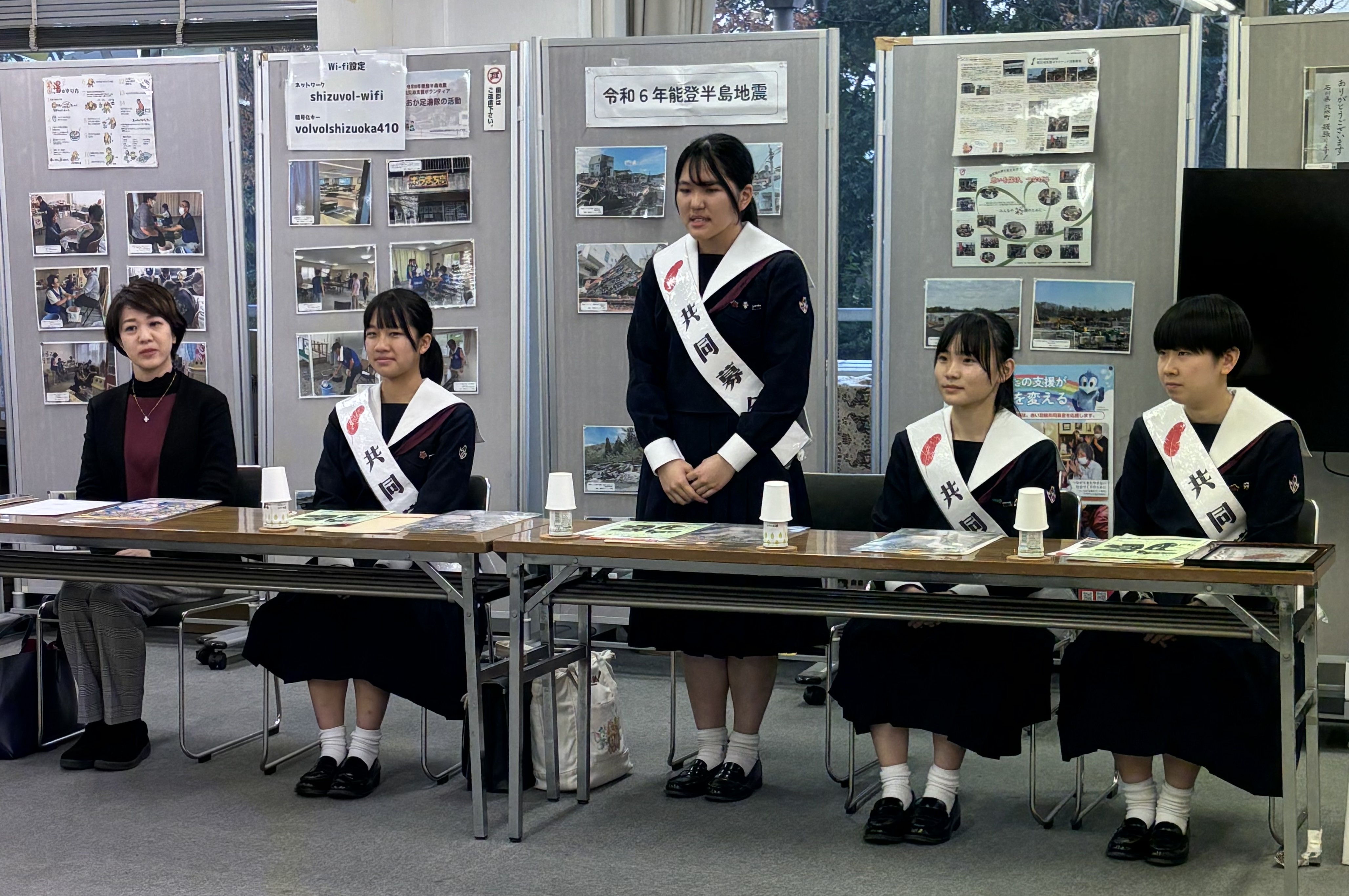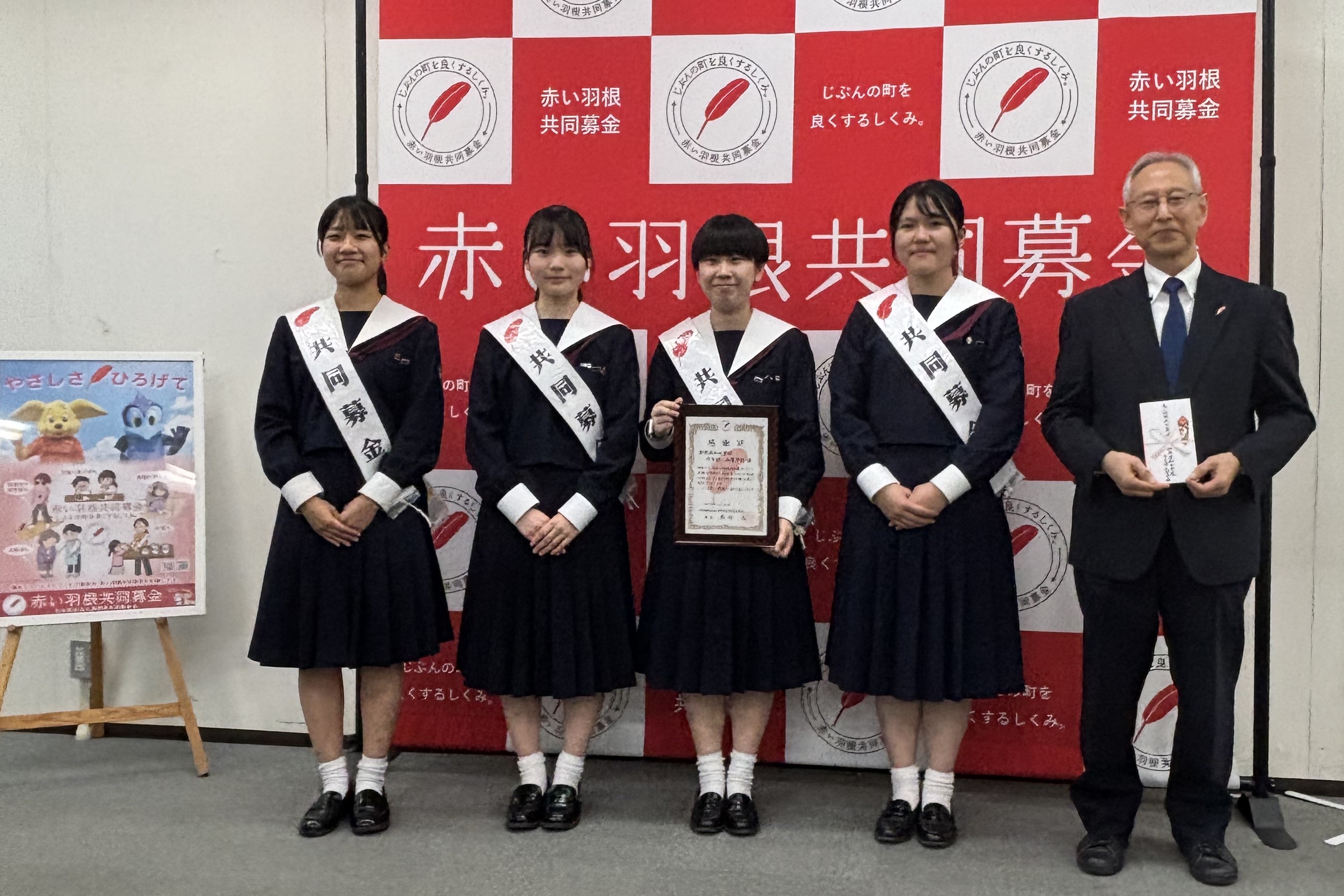 令和7年11月18日には、生徒会の代表4名が、シズウェルを訪問し、静岡県共同募金会の影島常務理事に寄付金を託されました。