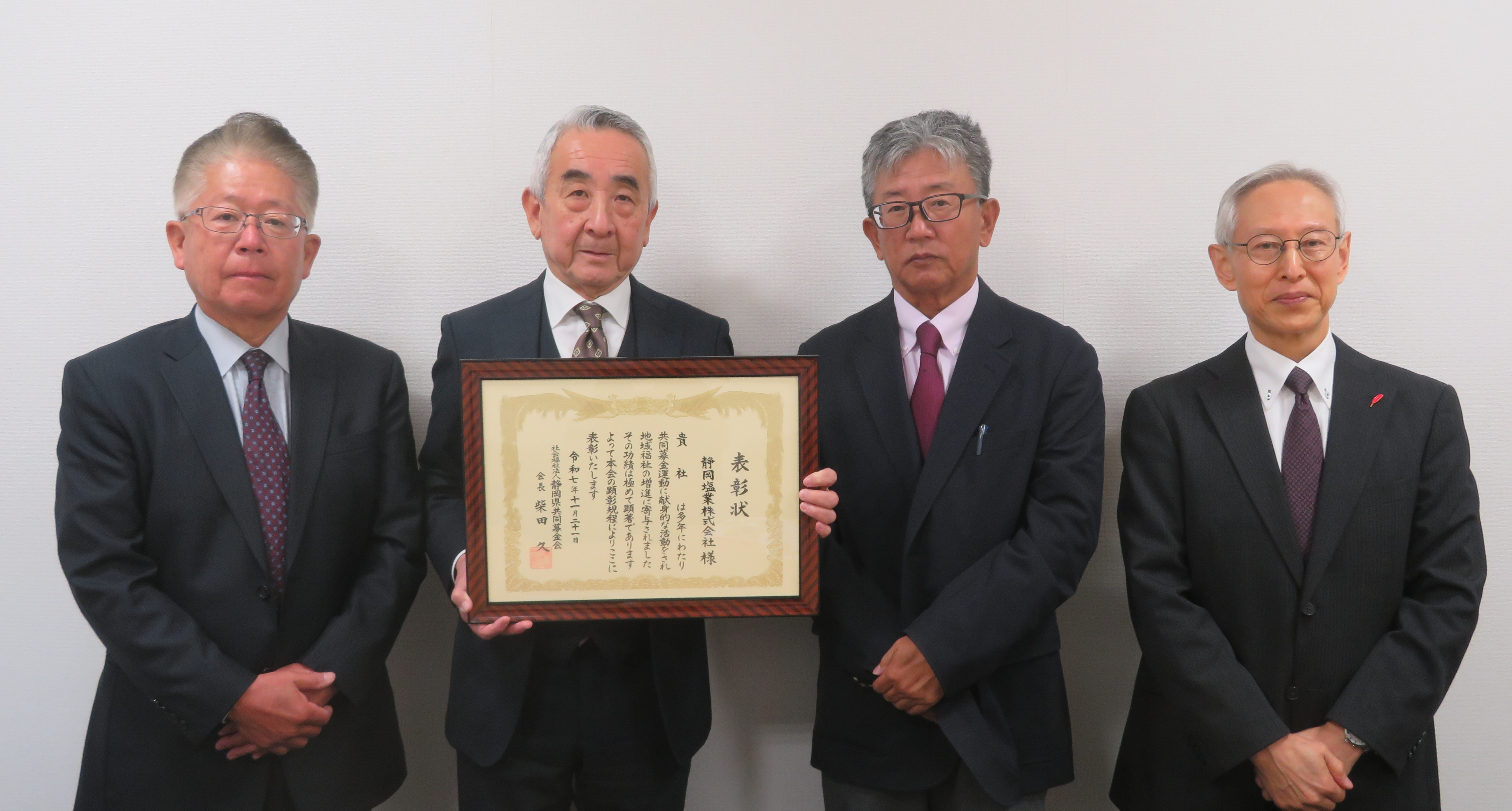 このたび、表彰状を伝達させていただきました。 謹んで御礼申し上げます。(左より順に)静岡塩業株式会社 常務取締役 山田浩史 様静岡塩業株式会社 代表取締役社長 水野直人 様静岡塩業株式会社 シニアアドバイザー 黒木秀俊 様静岡県共同募金会 常務理事 影島秀明