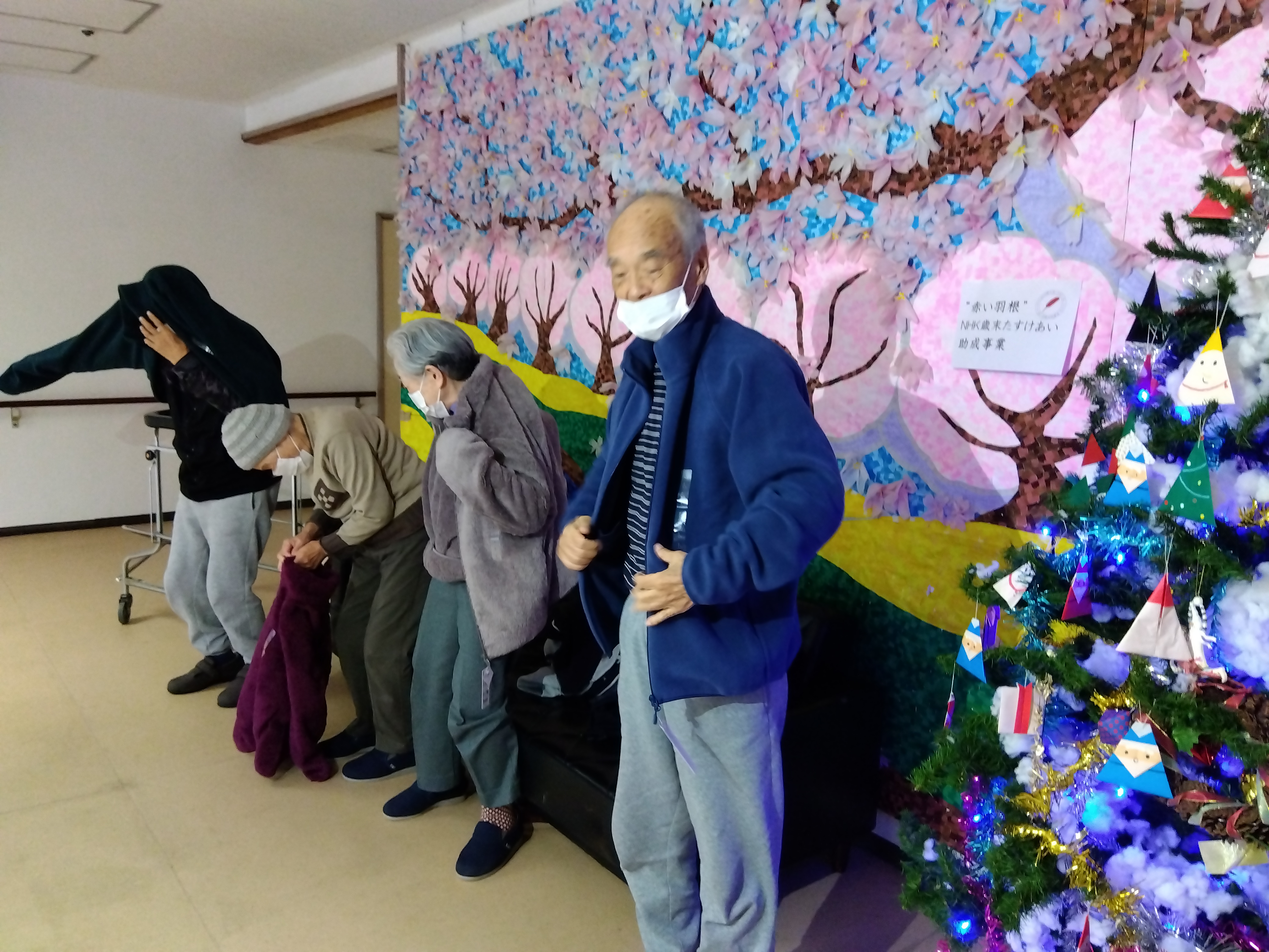 クリスマス会であたたかい冬用の上着をプレゼントさせて頂きました。さっそくその場で着替え、「ふわふわで首元まで、とてもあたたかい」と、とても喜んでおりました。それぞれが好きな色の上着を選んだので、「あなたの色も素敵ね」等、楽しく会話しながら、クリスマス会を楽しんでおりました。お正月には、新年会のメニューとして、うな重を提供させて頂きました。「おいしい」と、にこにこしながら、食べていました。物価高騰が進んでいる中、NHK歳末助け合い助成金を活用させて頂いたおかげで、このような豪華な食事を提供することができました。ありがとうございました。