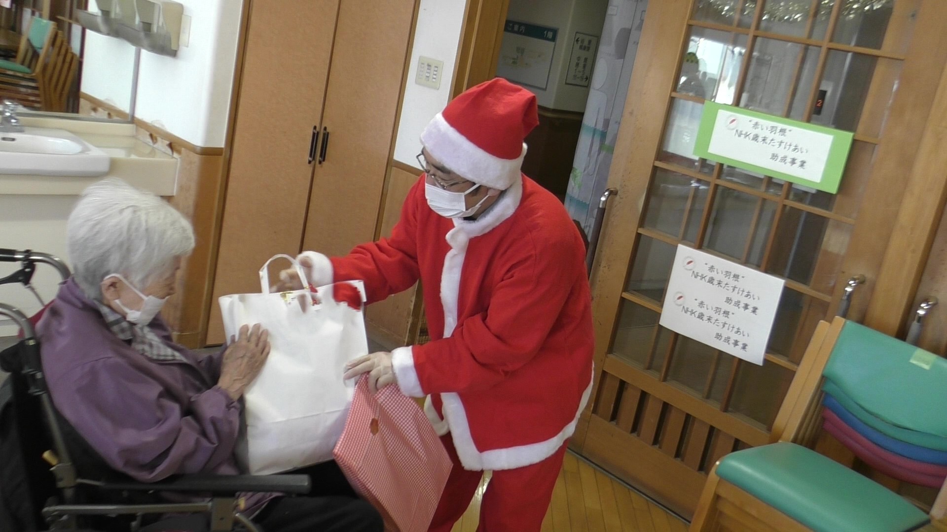 この度は歳末たすけあいの助成金をいただき、誠にありがとうございました。利用者の皆様にクリスマスプレゼントとしてルームウェアとお菓子、さらに年末年始用のお菓子を配らせていただきました。利用者から、プレゼントを貰って「お部屋で着るのに丁度いい、温かいよ」「こういう明るい色の物が欲しかった。うれしい!」「大切に着ます」などの声が聞かれました。大変喜んでいました。今年度も、本当にありがとうございました。