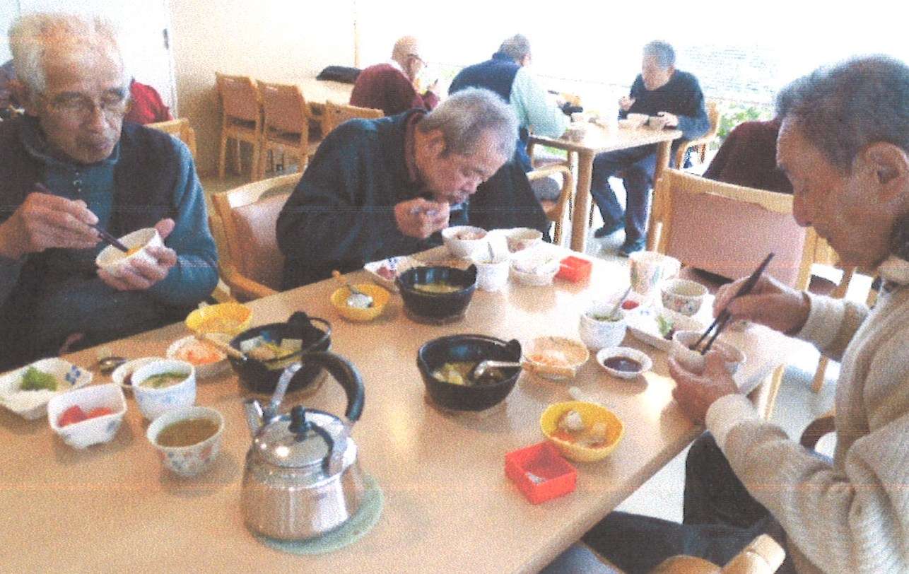 新年のつどいでは、福笑いとおみくじで正月らしさを味わいました。昼食には一人づつ鍋料理を中心とした豪華なお膳と、大好きな甘酒も出て大変喜ばれ、おかわりが欲しいとの声も。コーヒーやお菓子で1月のおやつをお正月らしく豪華に提供もさせていただきました。